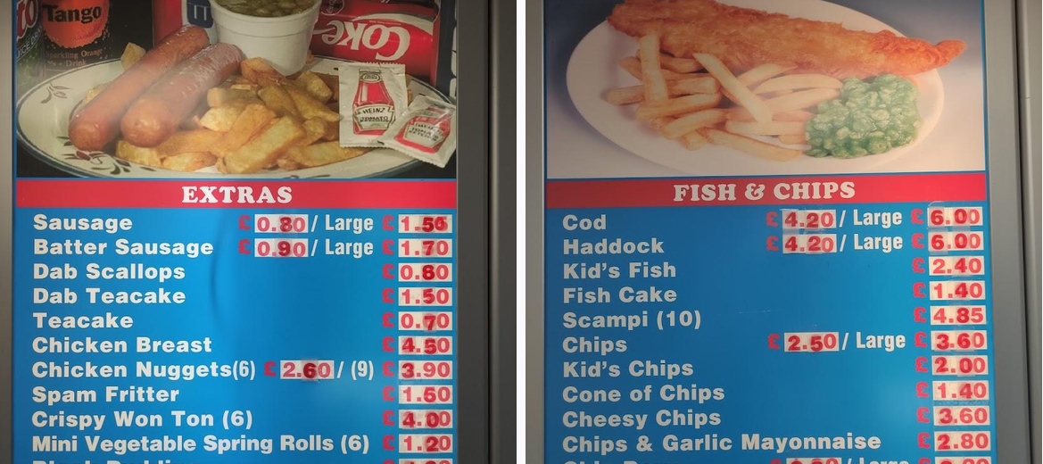Expect a classic menu featuring fish and chips items like cod, haddock, and fish cakes, along with kid's meals and tasty extras such as sausage and dab scallops.